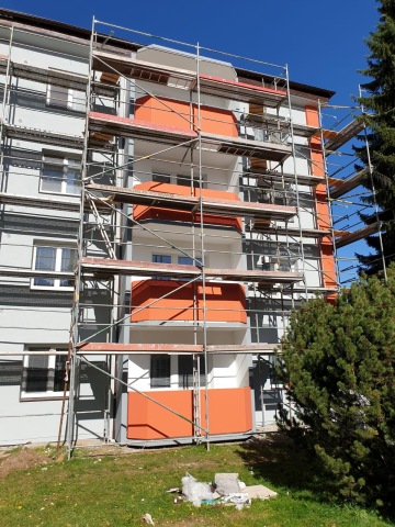 Velký bytový dům v Trenčianských Teplicích (Slovensko) a jeho revitalizace včetně přístavby nových lodžií. Celkově bylo realizováno 108 lodžií, vše probíhalo dle plánu a nájemníci si mohou užívat nového venkovního prostoru.