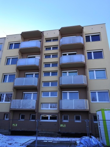 Na bytovém domě v Karviné (ulice Ve svahu) jsme realizovali 24 ks nových lodžií obdélníkového tvaru. Lodžie mají hliníkové zábradlí se skleněnou výplní. Dům prošel celkovou revitalizací a nové lodžie s novou fasádou mu velmi sluší.