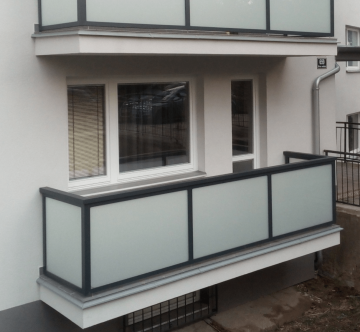 Velké Meziříčí, ulice Poštovní - nové lodžie s hliníkovým zábradlím s výplni z bezpečnostního skla.