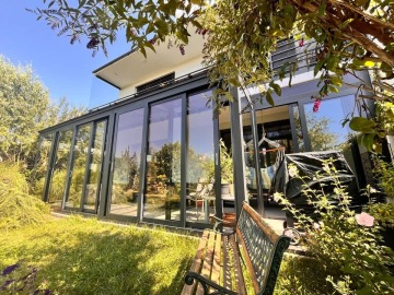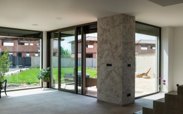 Přízemí domu - kombinace posuvných dveří a fixních oken.