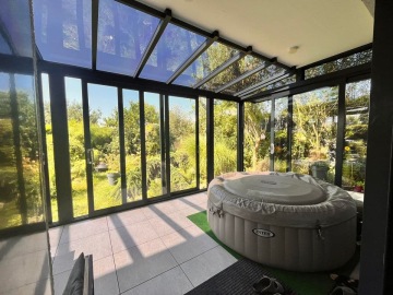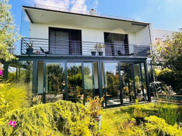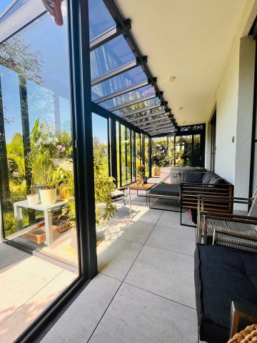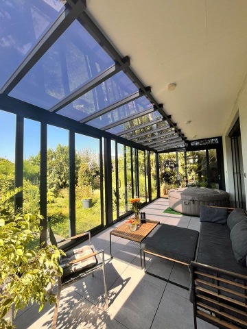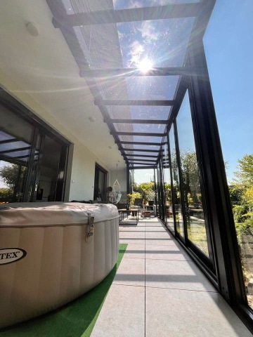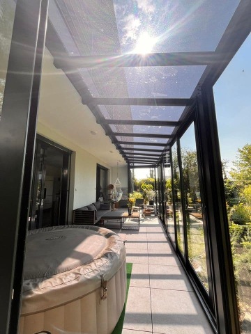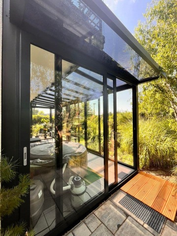 Pergola u rodinného domu - zasklení bočních stěn pomocí fixních i posuvných modulů. Celá realizace je tvořena dvěma fixními poli a celkem deseti posuvnými díly, které umožňují spojení obytného prostoru se zahradou v jakémkoliv počasí.