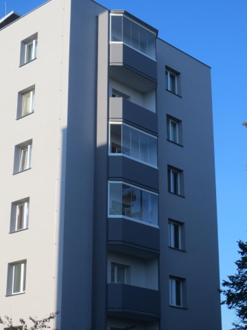 Třebíč je naše oblíbená destinace, kde je velké množství bytových domů a v nich spokojených nájemníků, kteří si užívají naše lodžie:-). Na ulici Modřinové jsme na 8mi patrovém domě vyměnili čtyřia sloupce starých balkonů za prostorné lodžie obdélníkového tvaru. Výplň zábradlí tvoří matné sklo v bronzovém odstínu - v Třebíči velmi oblíbená varianta.
