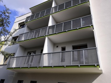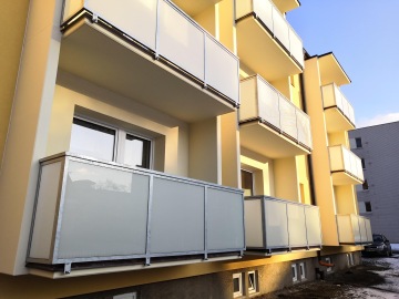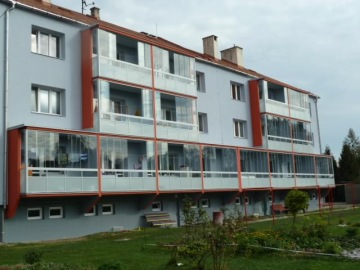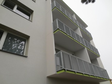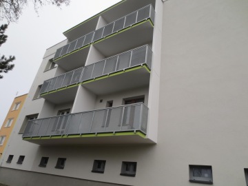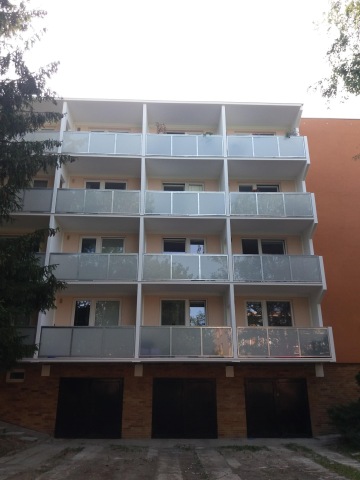 Rozsah prací: nové lodžie 24 ks, žárově-zinkované zábradlí s matným, bezpečnostním sklem.