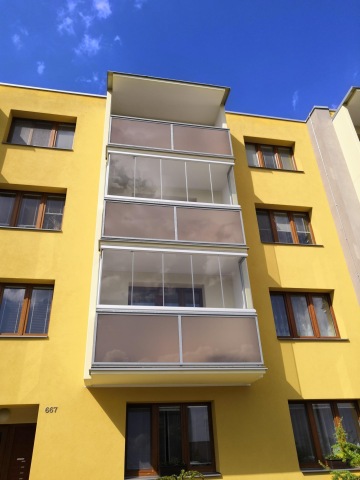 Zakázka na panelovém domě v Praze se týkala výměny zábradlí na stávajících lodžiích. Staré, nevyhovující a rezavé zábradlí jsme vyměnili za nové zábradlí z hliníkových profilů. Výplň zábradlí je z mléčného, bezpečnostního skla a jednotlivým majitelům bytů jsem vyšli vstříc a instalovali jsme i sklo průhledné, aby jejich domácí mazlíčci měli přehled, co se děje za domem:-). Samozřejmostí byla i demontáž a montáž původního zasklení lodžií. Osobní přístup na této zakázce byl z obou stran zárukou kvality díla.