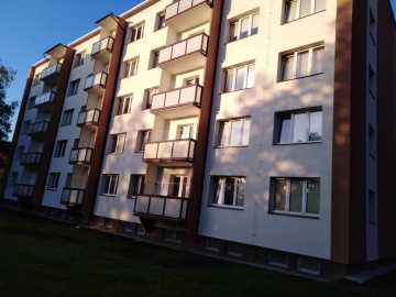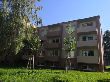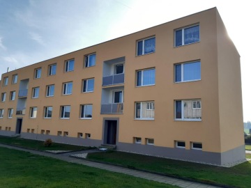 Na Vysočině v městě Křižanov jsme v roce 2019 realizovali celou rekonstrukci bytového domu, který se skládá ze čtyř samostatných vchodů. Dům byl kompletně zateplen a staré balkony byly vyměněny za nové lodžie se zábradlím se skleněnou výplní. Lodžie mají zkosenou podestu, velmi dobře se hodí k tomuto typu domu a celek působí příjemně a citlivě.
