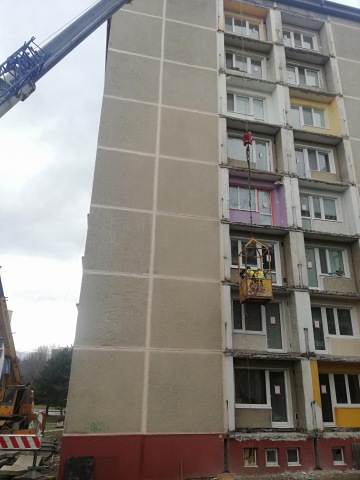 Rozsah prác: nové lodžie FB 01 s betónovým zábradlím, – 32 ks, rámové zasklenie lodžií, oprava strechy so zateplením.