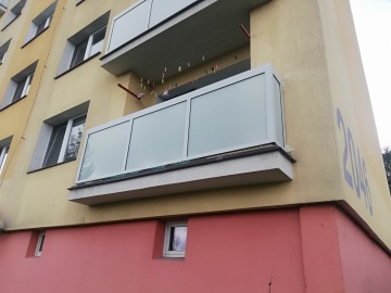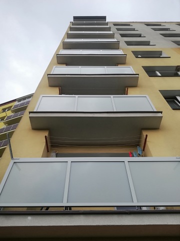 Nové, hliníkové zábradlie na existujúcich lodžiách na bytovom dome. Zábradlie je s výplňou z bezpečnostného, mliečneho skla.